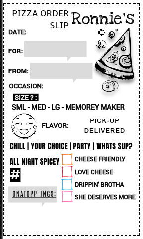 INCLUDES: 1 BOX DESIGN & 1 IMAGE CARD (PAPERCRAFT) DESIGN, 1 GIFT CARD (PIZZA ORDER SLIP) DESIGN, TISSUE PAPER/NEWSPRINT AND A BOW (OPTIONAL)